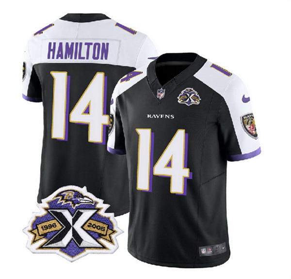Home>NFL>Baltimore Ravens>Men>Men Baltimore Ravens 14 Kyle Hamilton Black White 2023 F U S E With Patch Throwback Vapor Limited Jersey