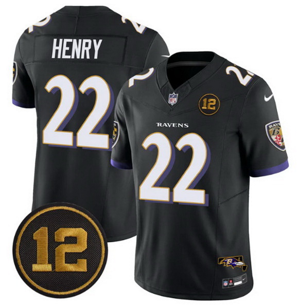 Men Baltimore Ravens 22 Derrick Henry Black 2025 F U S E Jacoby Jones Patch Vapor Limited Football Jersey