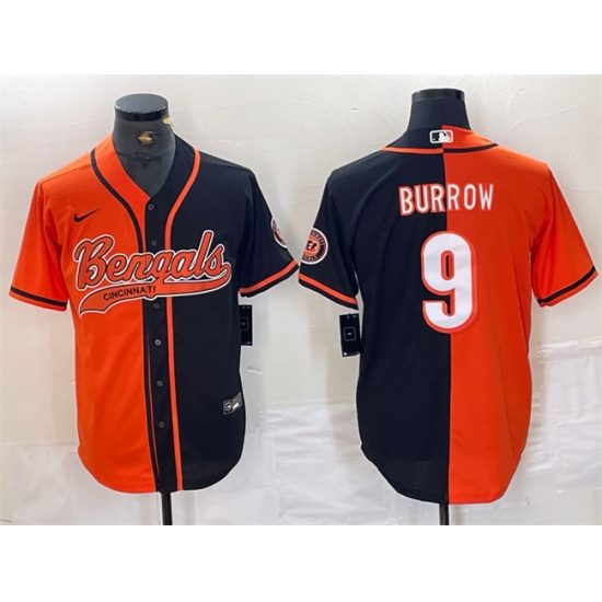 Men Cincinnati Bengals 9 Joe Burrow Black Orange Split With Patch Cool Base Stitched Baseball Jersey
