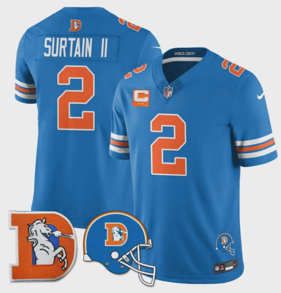 Home>NFL>Denver Broncos>Men>Men Denver Broncos Throwback 3 Times Champions Patch Vapor Limited All Stitched Blue #2 Patrick Surtain II Jersey