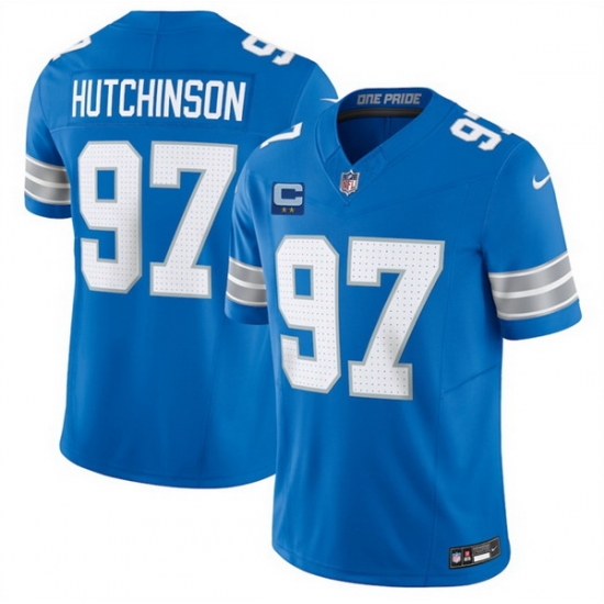 Men Detroit Lions 97 Aidan Hutchinson Blue 2025 F U S E With 2 Star C Patch Vapor Limited Stitched Jersey