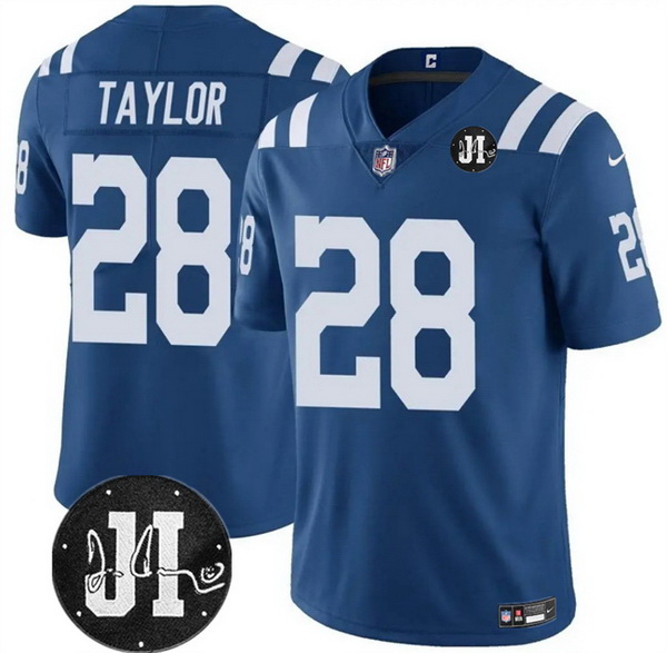 Men Indianapolis Colts 28 Jonathan Taylor Blue Jim Irsay Patch Vapor Stitched Jersey