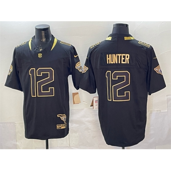Men Jacksonville Jaguars 12 Travis Hunter Black Gold 2025 F U S E With Patch Vapor Untouchable Limited Stitched Jersey