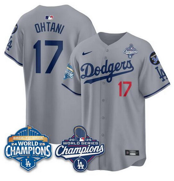 Men Los Angeles Dodgers 17 Shohei Ohtani Grey 2025 World Series Champions 26 Back to Back Champions With No 34 Patch Limited Stitched Baseball Jersey
