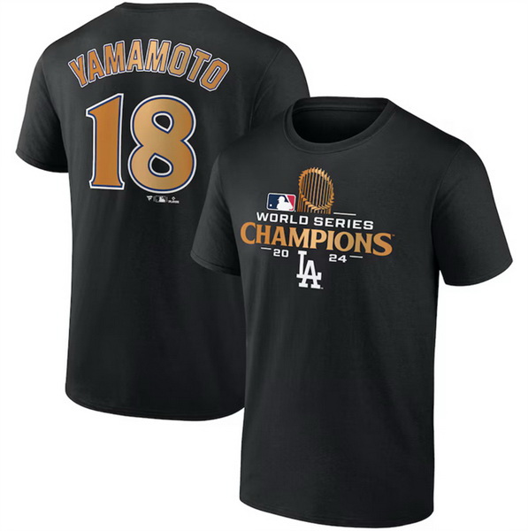 Home>MLB>2024 World Series Champions>T Shirts>Men Los Angeles Dodgers 18 Yoshinobu Yamamoto Black 2024 World Series Champions Name 26 Number T Shirt