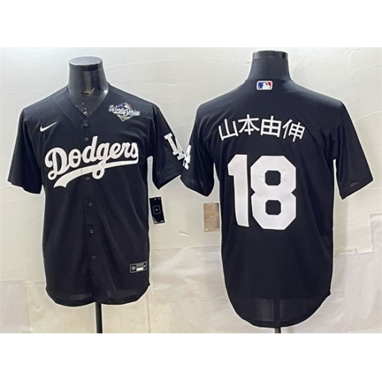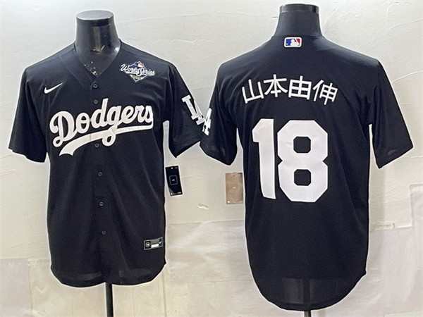 Home>MLB>Los Angeles Dodgers>Men>Men Los Angeles Dodgers 18 Yoshinobu Yamamoto Black 2025 World Series Patch Cool Base Stitched Baseball Jersey