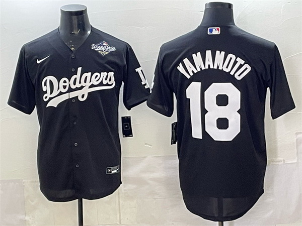 Home>MLB>Los Angeles Dodgers>Men>Men Los Angeles Dodgers 18 Yoshinobu Yamamoto Black 2025 World Series Patch Cool Base Stitched Baseball Jersey