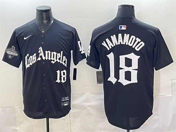 Home>MLB>Los Angeles Dodgers>Men>Men Los Angeles Dodgers 18 Yoshinobu Yamamoto Black LA Gothic Style With 2025 World Series Champions Patch Limited Stitched Baseball Jersey