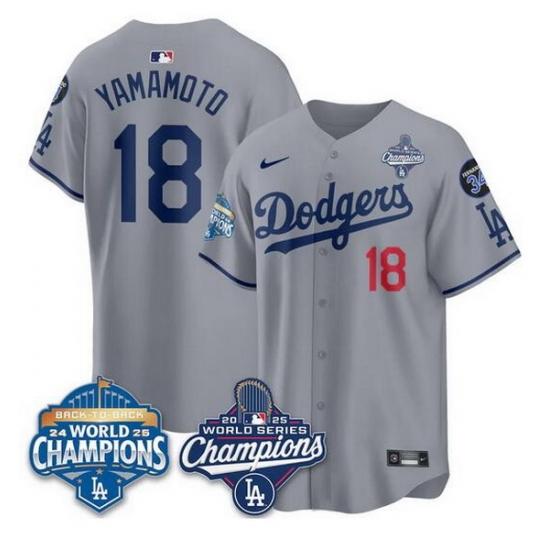 Home>MLB>Los Angeles Dodgers>Men>Men Los Angeles Dodgers 18 Yoshinobu Yamamoto Grey 2025 World Series Champions 26 Back to Back Champions With No 34 Patch Limited Stitched Baseball Jersey