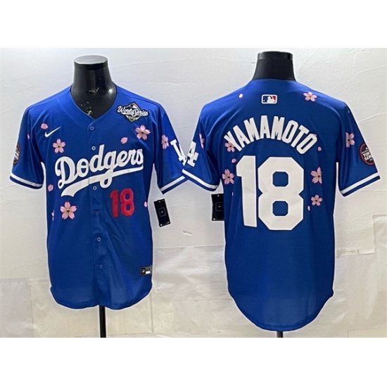 Men Los Angeles Dodgers 18 Yoshinobu Yamamoto Royal 2025 World Series Patch Tokyo Series Limited Stitched Baseball Jersey