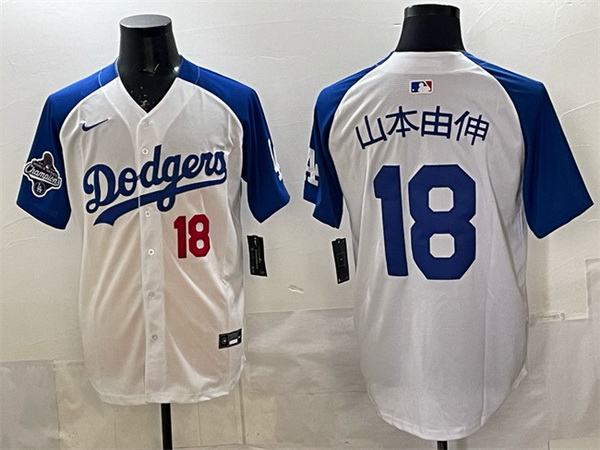 Home>MLB>Los Angeles Dodgers>Men>Men Los Angeles Dodgers 18 Yoshinobu Yamamoto White Royal 2025 World Series Champions Patch Limited Stitched Baseball Jersey