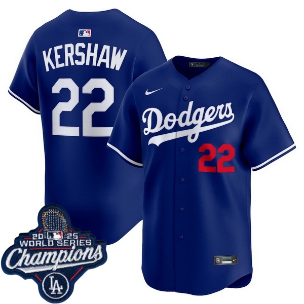 Men Los Angeles Dodgers 22 Clayton Kershaw Cool Base 2025 World Champions Stitched Baseball Jersey Blue