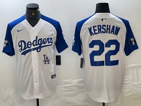 Men Los Angeles Dodgers 22 Clayton Kershaw White Blue Vin Patch Cool Base Stitched Baseball Jersey 1