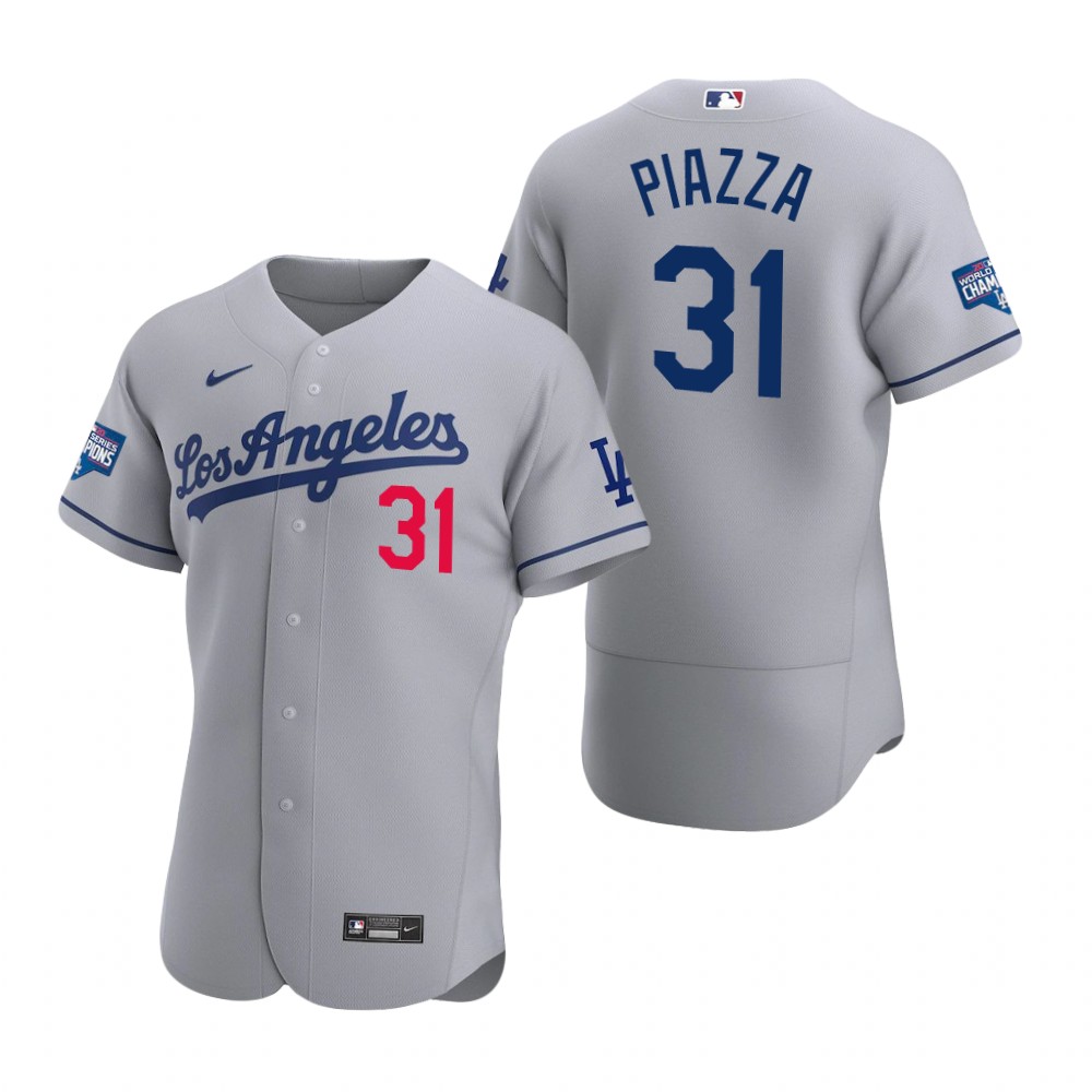 Home>MLB>Los Angeles Dodgers>Men>Men Los Angeles Dodgers 31 Mike Piazza Gray 2020 World Series Champions Road Flex Base Jersey