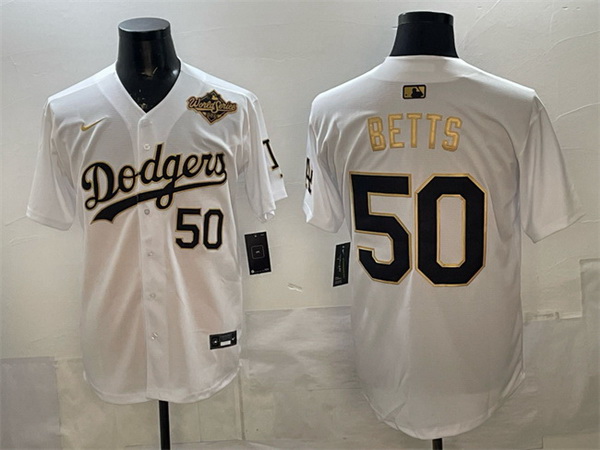 Men Los Angeles Dodgers 50 Mookie Betts White Gold 2025 World Series Patch Limited Stitched Baseball Jersey