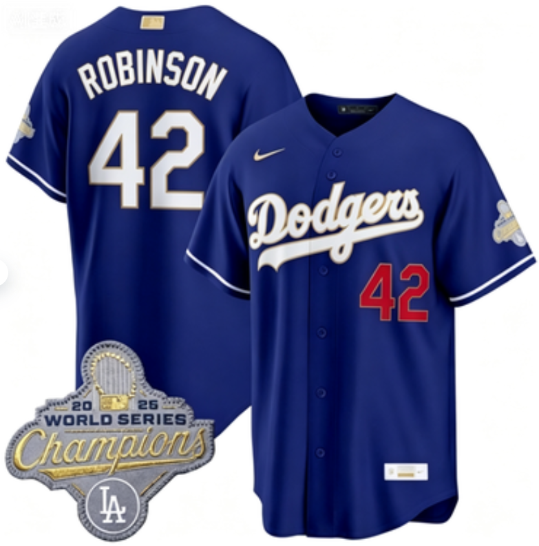 Home>MLB>Los Angeles Dodgers>Men>Men Los Angeles Dodgers Jackie Robinson #42 Royal 2026 Alternate Gold Collection Stadium Stitched Baseball Jersey