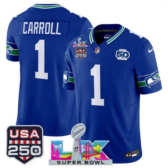 Home>NFL>2025 2026 Super Bowl LX>Seattle Seahawks>Men Seattle Seahawks 1 Pete Carroll Royal 2025 F U S E Super Bowl LX Patch And 50th Season USA 250 Patch Vapor Throwback Limited Stitched Football Jersey
