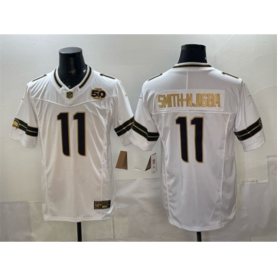 Men Seattle Seahawks 11 Jaxon Smith Njigba White Gold 2025 F U S E 50th Season Patch Limited Stitched Football Jersey