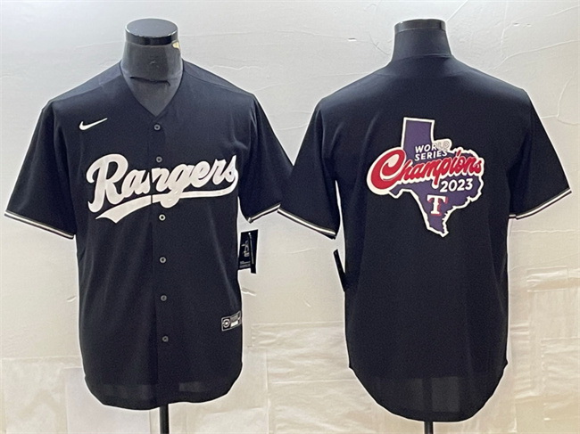 Men Texas Rangers Black 2023 World Series Champions Big Logo Cool Base Stitched Baseball Jersey