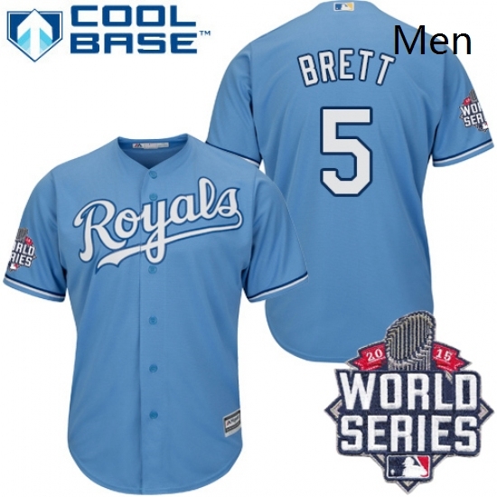 Mens Majestic Kansas City Royals 5 George Brett Replica Light Blue Alternate 1 Cool Base 2015 World Series Patch MLB Jersey