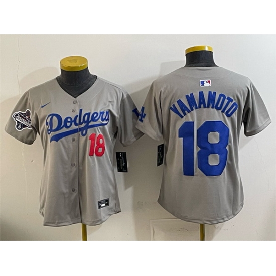Women Los Angeles Dodgers 18 Yoshinobu Yamamoto Grey 2025 World Series Champions Patch Limited Stitched Baseball Jersey