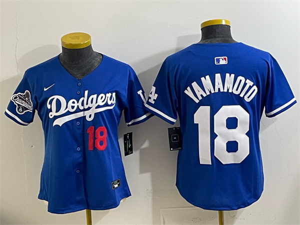 Women Los Angeles Dodgers 18 Yoshinobu Yamamoto Royal 2025 World Series Champions Patch Limited Stitched Baseball Jersey
