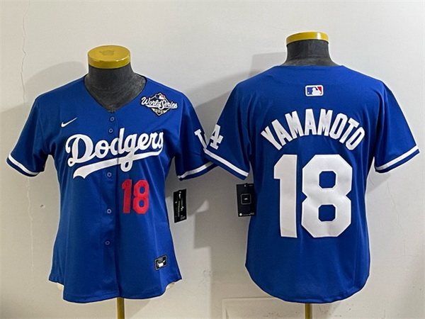 Women Los Angeles Dodgers 18 Yoshinobu Yamamoto Royal 2025 World Series Patch Limited Stitched Baseball Jersey