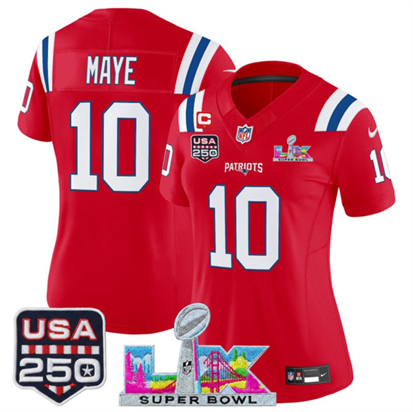Home>NFL>2025 2026 Super Bowl LX>New England Patriots>Women New England Patriots 10 Drake Maye Red 2025 F U S E 1 Star C Patch And Super Bowl LX Patch 26 USA 250 27 Patch Vapor Limited Football Stitched Jers