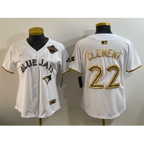 Home>MLB>Toronto Blue Jays>Women>Women Toronto Blue Jays 22 Ernie Clement White Gold 2025 American League Champions Limited Stitched Baseball Jersey