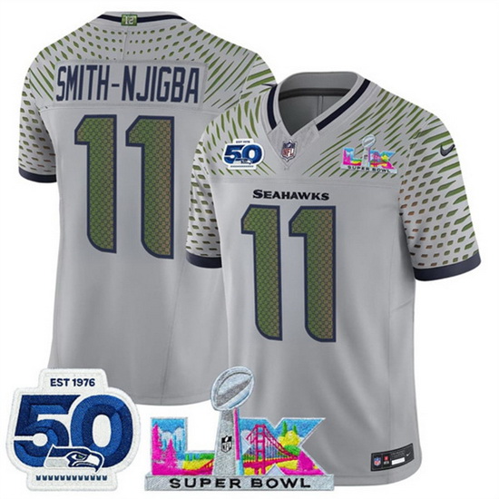 Home>NFL>2025 2026 Super Bowl LX>Seattle Seahawks>Youth Seattle Seahawks 11 Jaxon Smith Njigba Grey 2025 F U S E Super Bowl LX Patch And 50th Season Patch Rivalries Vapor Limited Stitched Football Jersey