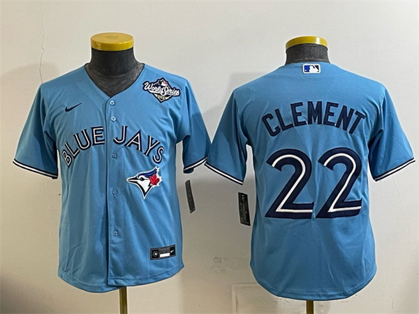 Home>MLB>Toronto Blue Jays>Youth>Youth Toronto Blue Jays 22 Ernie Clement Blue 2025 World Series Cool Base Stitched Baseball Jersey